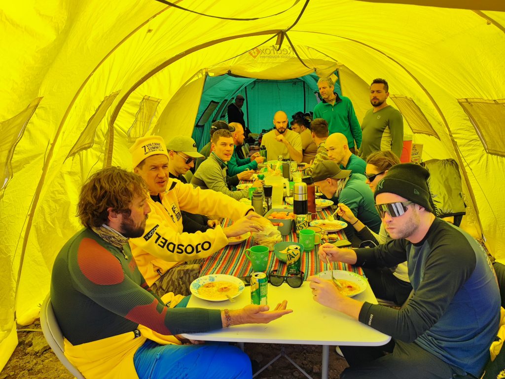 Structural Dome Kitchen Dining: Our innovative structural dome is a strong and versatile space, specifically designed to function as a kitchen and dining area at the base camp. With its resistance to high winds, fire and UV protection, and its ability to accommodate large groups, the dome provides a welcoming environment where you can enjoy meals and relax after a day of activities.